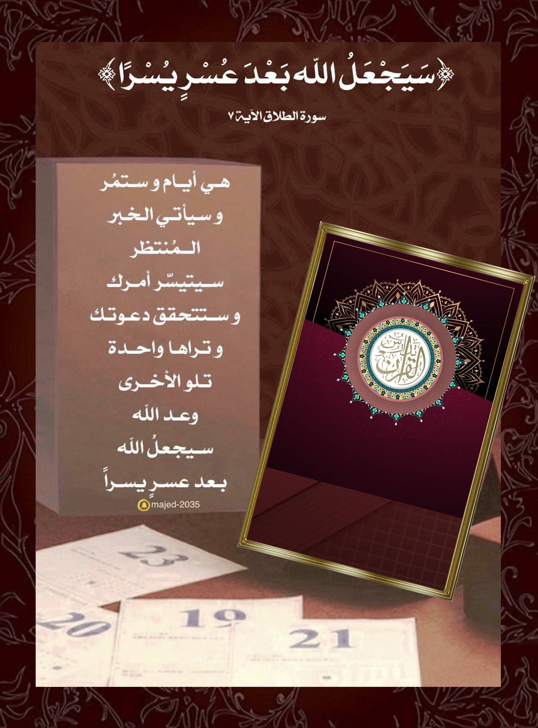 هي أيام وستمُر وسيأتي الخبر المنتظر سيتيسر أمرك وستتحقق دعوتك وتراها واحدة تلو الأخرى وعد الله سيجعلُ الله بعد عسر يسراً.