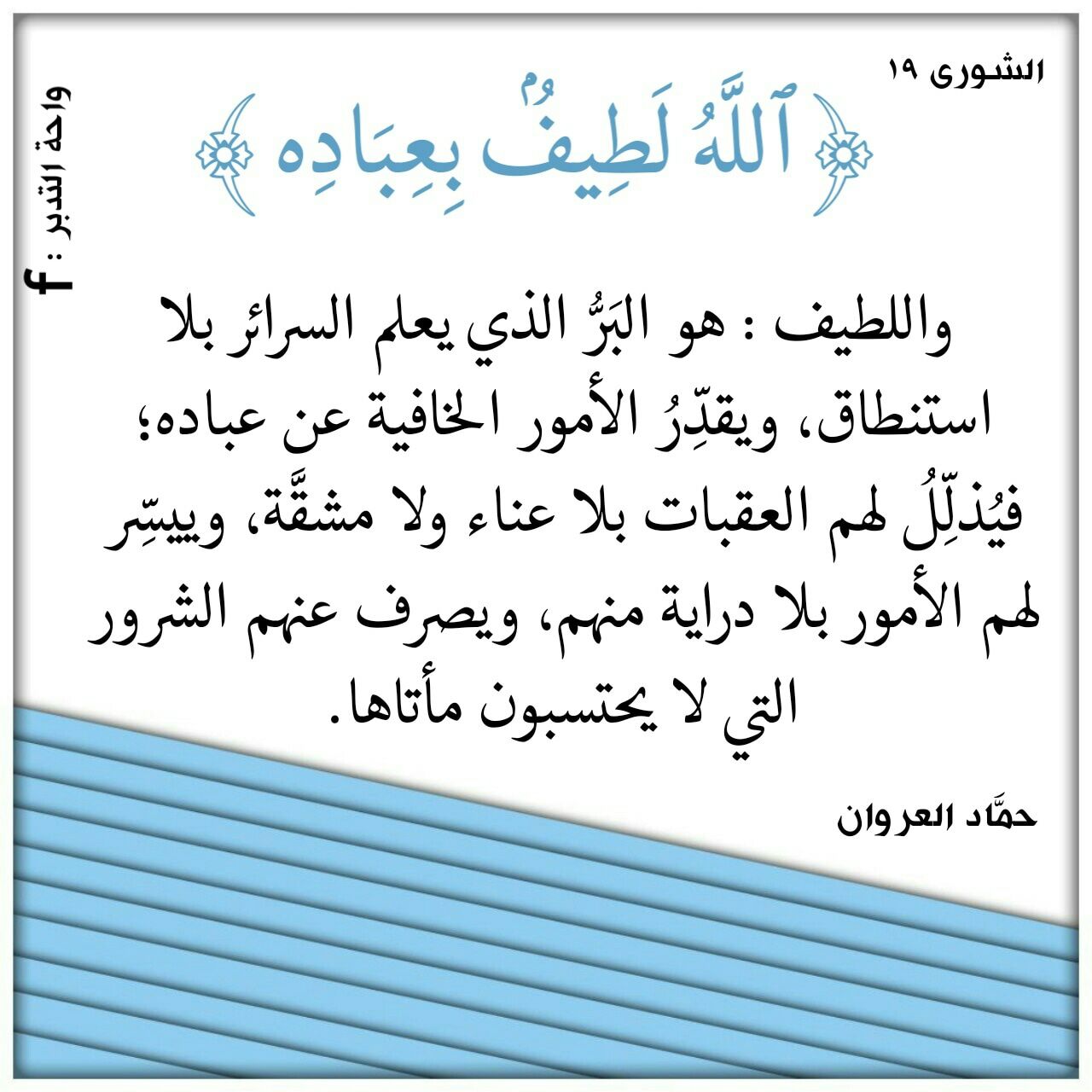 واللطيف: هو البرُّ الذي يعلم السرائر بلا استنطاق، ويقدِّرُ الأمور الخافية عن عباده؛ فيُذلِّلُ لهم العقبات بلا عناء ولا مشقَّة، وييسِّر لهم الأمور بلا دراية منهم، ويصرف عنهم الشرور التي لا يحتسبون مأتاها.