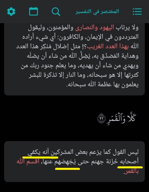س/ أرجو توضيح تفسير: ﴿كَلَّا وَالْقَمَرِ﴾ وإلى من يعود الضمير في قوله أصحابه (بالصورة المرفقة)؟