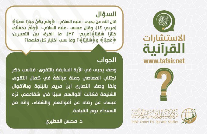 السؤال/ قال الله عن يحيى -عليه السلام-: ﴿وَلَمْ يَكُن جَبَّارًا عَصِيًّا﴾، وقال عيسى -عليه السلام-: ﴿وَلَمْ يَجْعَلْنِي جَبَّارًا شَقِيًّا﴾ ما الفرق بين التعبيرين: ﴿عَصِيَا﴾ و﴿شَقِيا﴾ ؟ وما سبب اختيار... المزيد