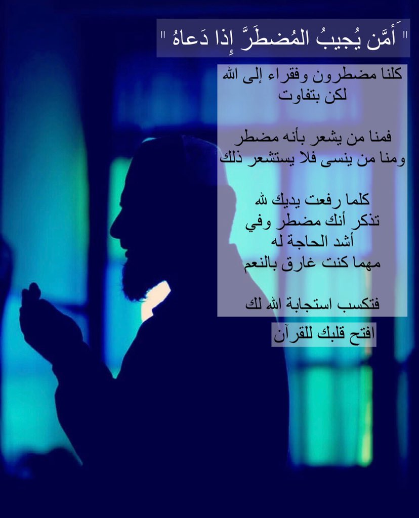 ﴿أَمَّن يُجِيبُ الْمُضْطَرَّ إِذَا دَعَاهُ﴾: كلنا مضطرون وفقراء إلى الله لكن بتفاوت فمنا من يشعر بأنه مضطر ومنا من ينسى فلا يستشعر ذلك كلما رفعت يديك الله تذكر أنك مضطر وفي أشد الحاجة له مهما كنت غارق بالنعم فتكسب استجابة الله لك.