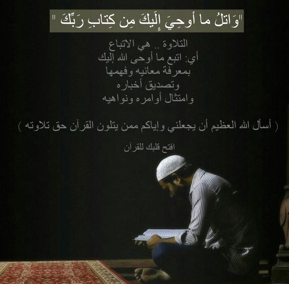 ﴿وَاتْلُ مَا أُوحِيَ إِلَيْكَ مِن كِتَابِ رَبِّكَ﴾: التلاوة .. هي الاتباع أي اتبع ما أوحى الله إليك بمعرفة معانيه وفهمها وتصديق أخباره وامتثال أوامره ونواهيه. (أسأل الله العظيم أن يجعلني وإياكم ممن يتلون القرآن حق تلاوته).
