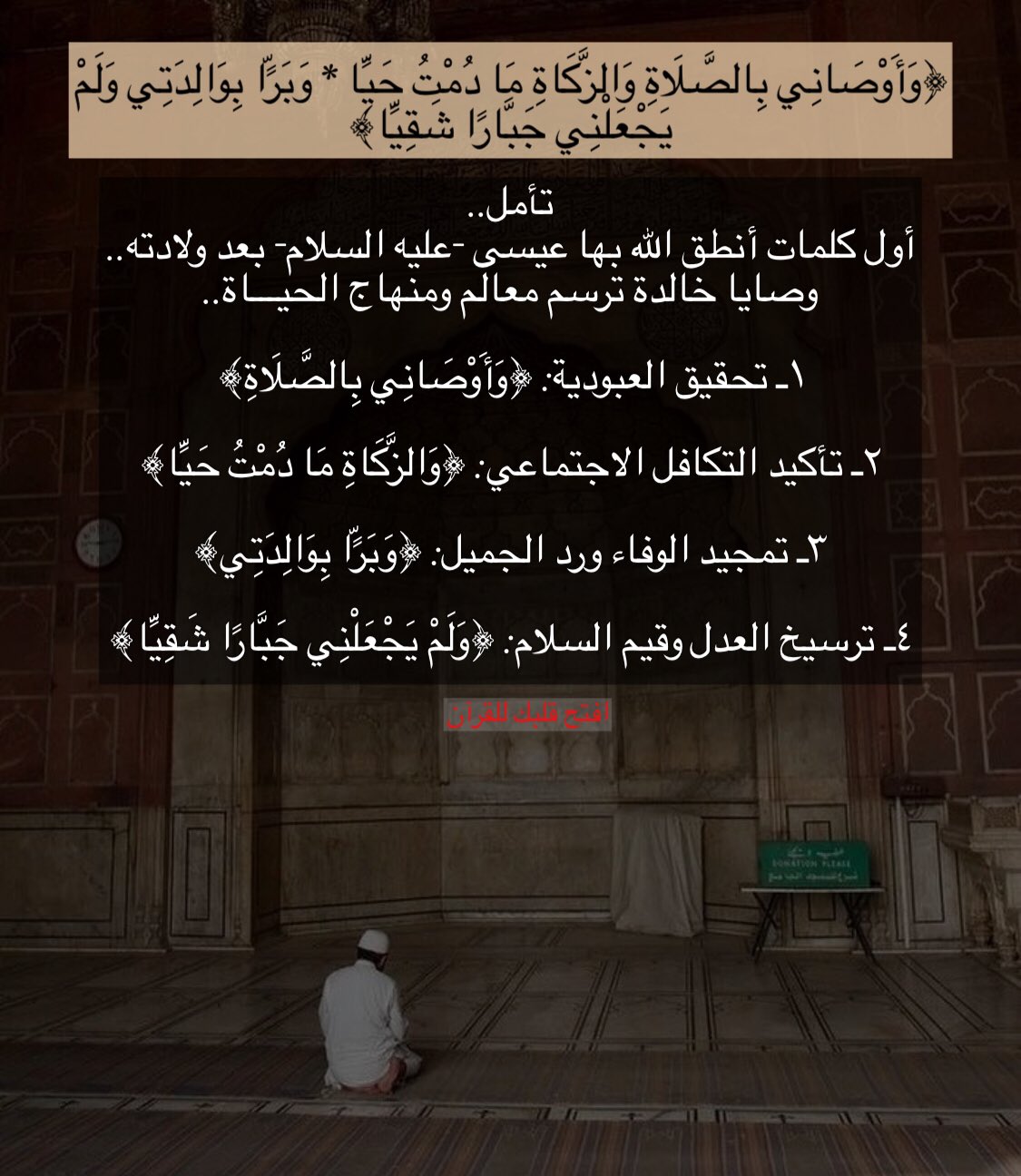 ﴿وَأَوْصَانِي بِالصَّلَاةِ وَالزَّكَاةِ مَا دُمْتُ حَيًّا ⋄ وَبَرًّا بِوَالِدَتِي وَلَمْ يَجْعَلْنِي جَبَّارًا شَقِيًّا﴾: