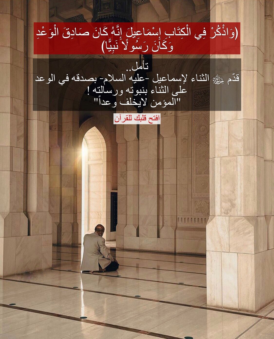 تأمل .. قدم ﴿ﷻ﴾ الثناء لإسماعيل - عليه السلام - بصدقه في الوعد على الثناء بنبوته ورسالته! "المؤمن لايخلف وعداً".