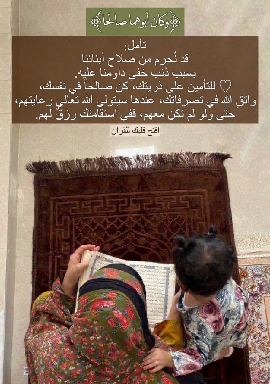 تأمل: قد نُحرم من صلاح أبنائنا بسبب ذنب خفي داومنا عليه. للتأمين على ذريتك، كن صالحاً في نفسك، واتق الله في تصرفاتك، عندها سيتولى الله تعالي رعايتهم، حتى ولو لم تكن معهم، ففي استقامتك رزقٌ لهم.