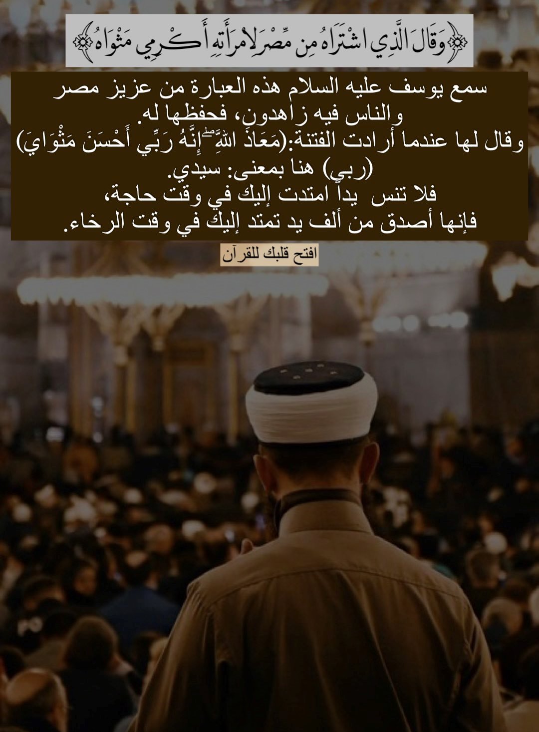 سمع يوسف عليه السلام هذه العبارة من عزيز مصر والناس فيه زاهدون، فحفظها له. وقال لها عندما أرادت الفتنة: (مَعَاذَ اللَّهِ إِنّ... المزيد