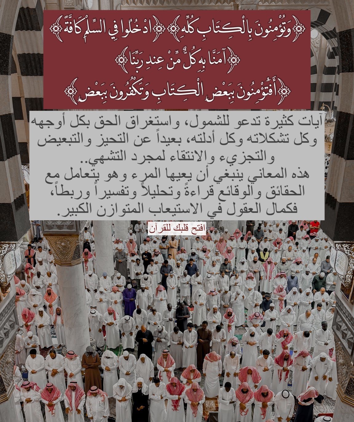 ﴿وَتُؤْمِنُونَ بِالْكِتَابِ كُلِّهِ﴾ ، ﴿ادْخُلُوا فِي السِّلْمِ كَافَّةً﴾ ، ﴿آمَنَّا بِهِ كُلٌّ مِّنْ عِندِ رَبِّنَا﴾ ، ﴿أَفَتُؤْمِنُونَ بِبَعْضِ الْكِتَابِ وَتَكْفُرُونَ بِبَعْضٍ﴾