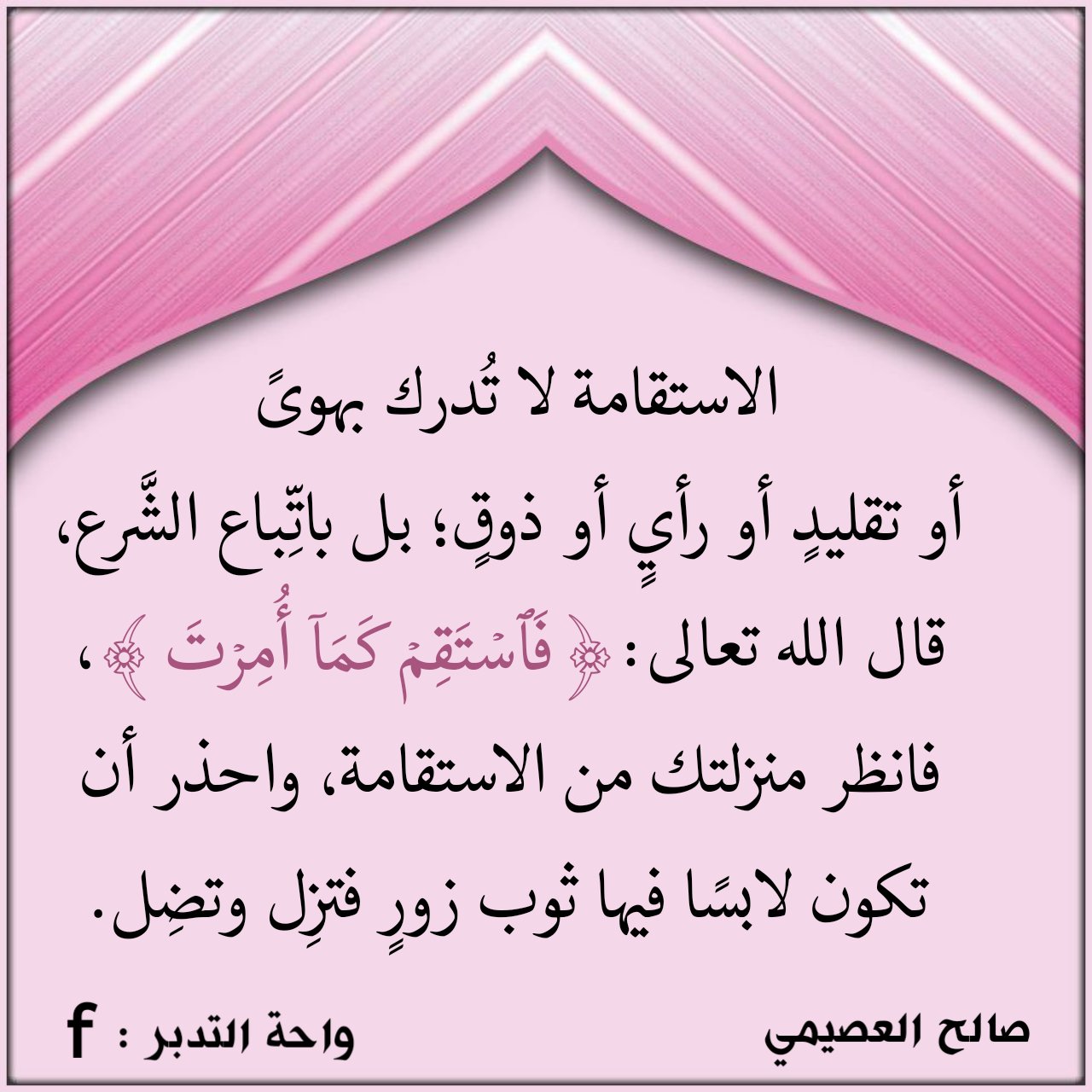 الاستقامة لا تُدرك بهوىً أو تقليدٍ أو رأيٍ أو ذوقٍ؛ بل باتِّباع الشَّرع، قال الله تعالى: (فَاسْتَقِمْ كَمَا أُمِرْتَ) فانظر منزلتك من الاستقامة، واحذر أن تكون لابسًا فيها ثوب زورٍ فتزِل وتضِل.