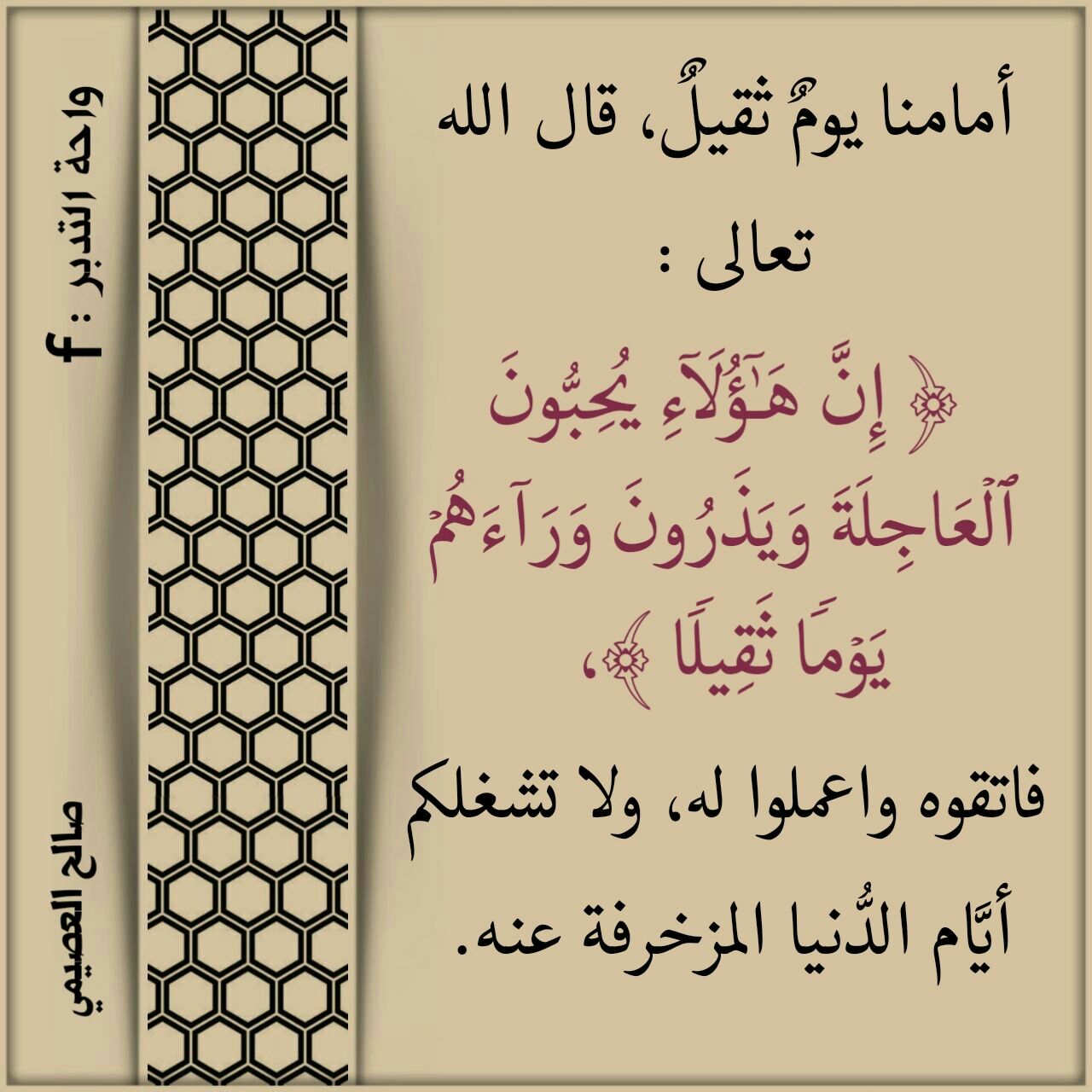 أمامنا يومٌ ثقيلٌ، قال الله تعالى: (إِنَّ هَؤُلَاءِ يُحِبُّونَ الْعَاجِلَةَ وَيَذَرُونَ وَرَاءَهُمْ يَوْمًا ثَقِيلًا)، فاتقوه واعملوا له، ولا تشغلكم أيَّام الدُّنيا المزخرفة عنه.