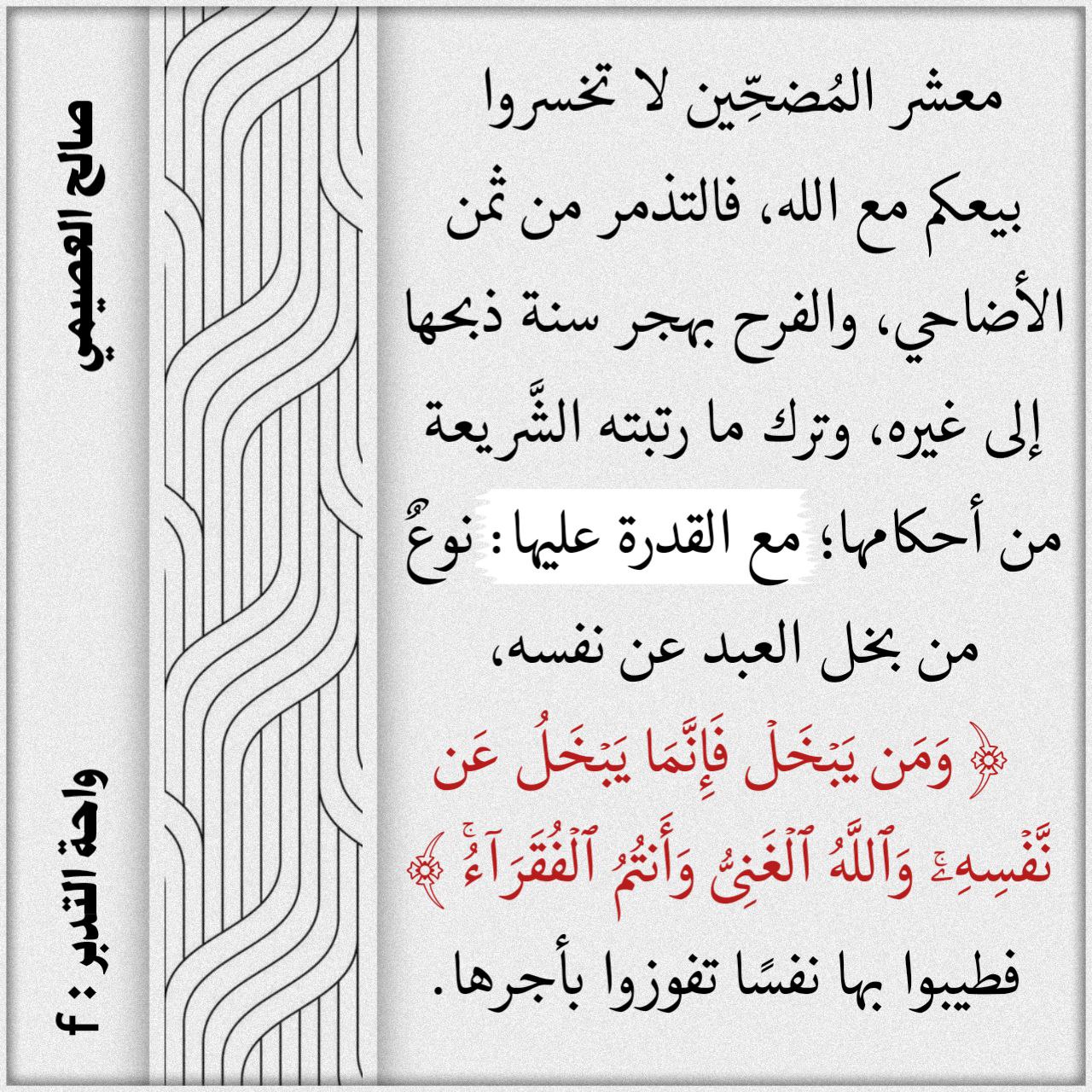 معشر المُضحِّين لا تخسروا بيعكم مع الله، فالتذمر من ثمن الأضاحي، والفرح بهجر سنة ذبحها إلى غيره، وترك ما... المزيد