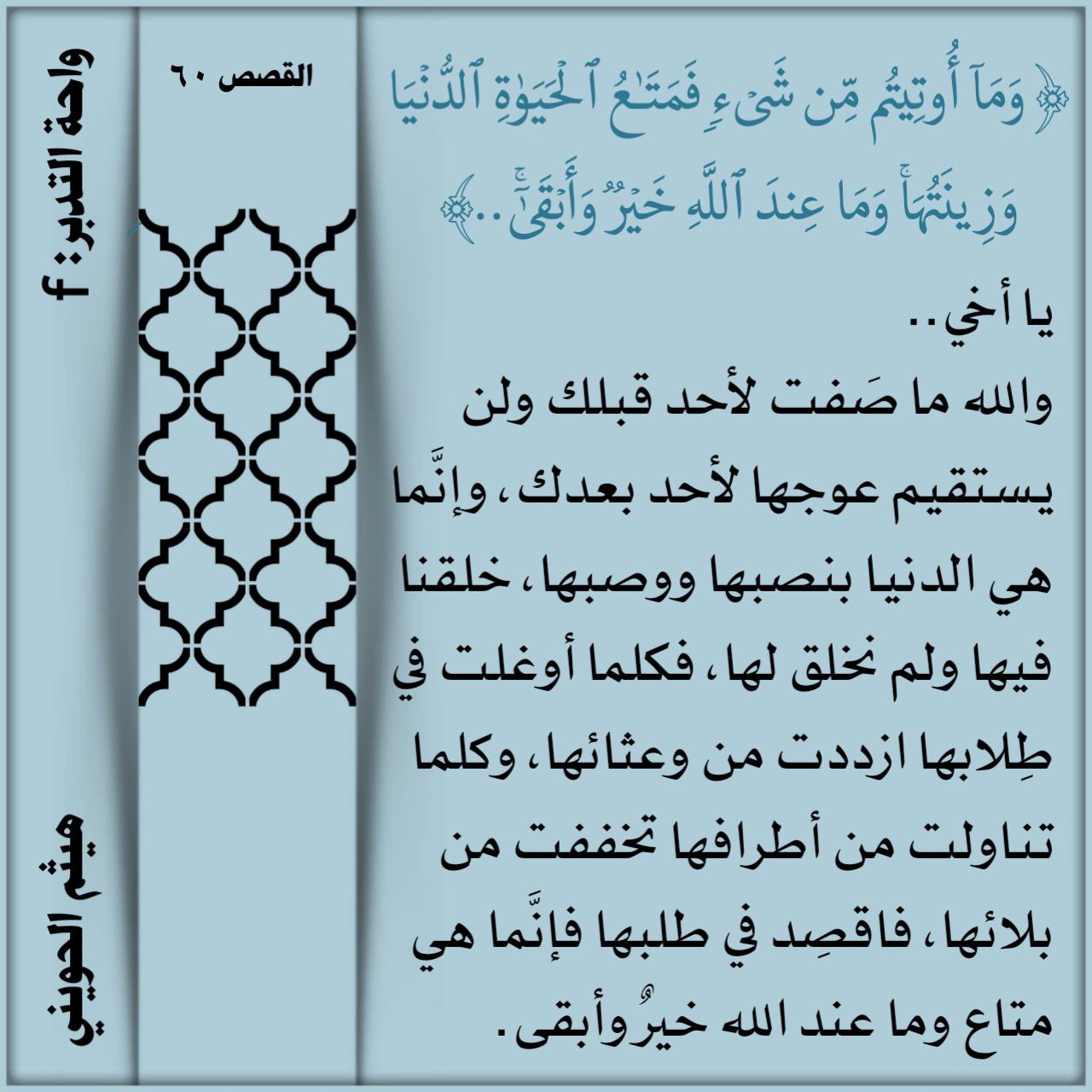 والله ما صَفت لأحد قبلك ولن يستقيم عوجها لأحد بعدك، وإنَّما هي الدنيا بنصبها ووصبها، خلق... المزيد