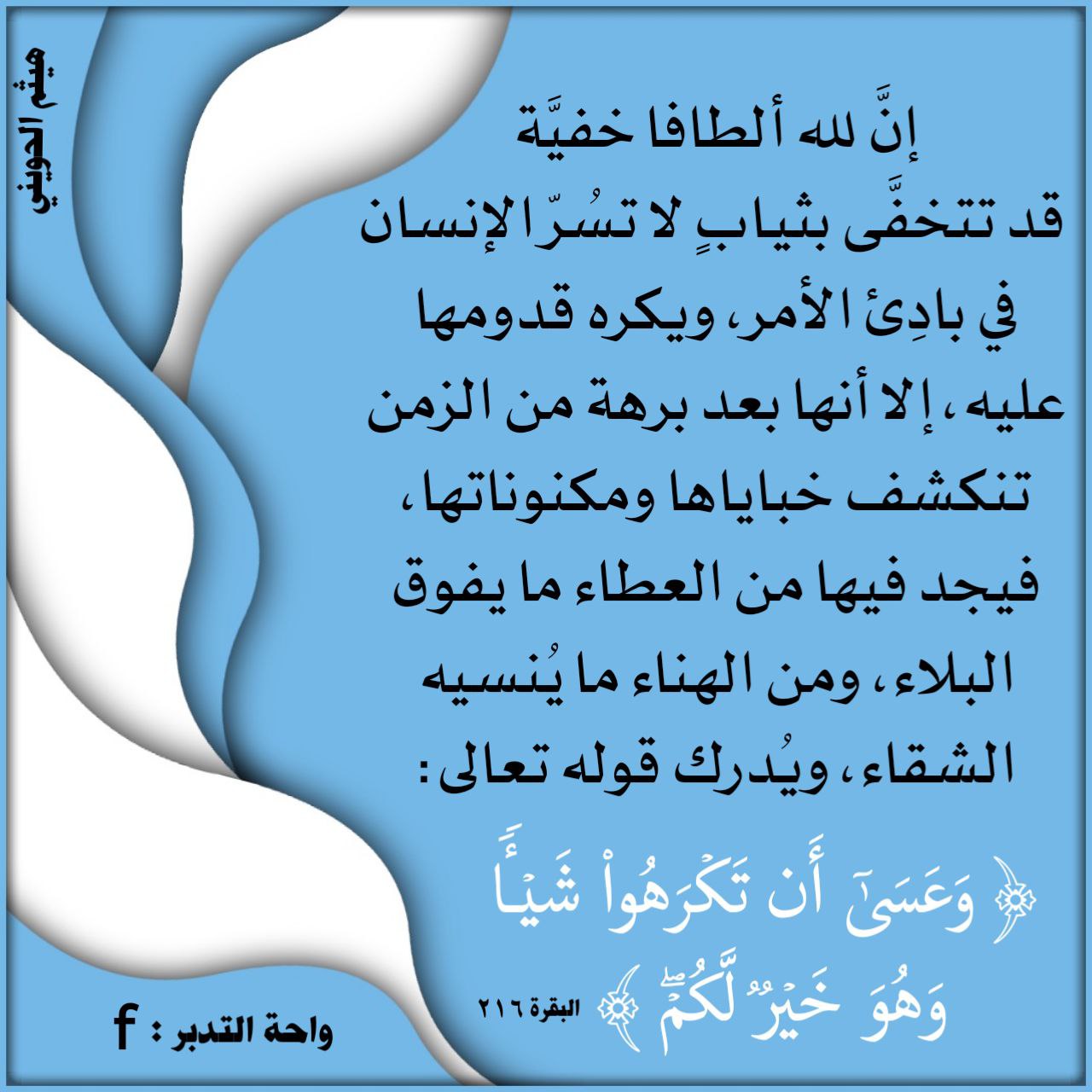 إنَّ لله ألطافا خفيَّة قد تتخفَّى بثيابٍ لا تسُرّ الإنسان في بادِئ الأمر، ويكره قدومها عليه، إلا أنها بعد برهة من الزمن تنكشف خباياها ومكنوناتها،... المزيد
