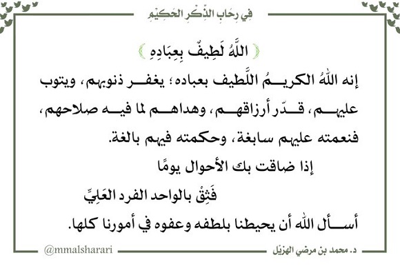 إنه اللهُ الكريمُ اللَّطيف بعباده؛ يغفر ذنوبهم، ويتوب عليهم، قدّر أرزاقهم، وهداهم لما فيه صلاحهم، فنعمته عليهم سابغة، وحكمته فيهم بالغة. إذا ضاقت بك الأحوال يومًا، فَثِقْ بالواحد الفرد العَلِيِّ. أسأل ﷲ أن يحيطنا بلطفه وعفوه في أمورنا كلها.