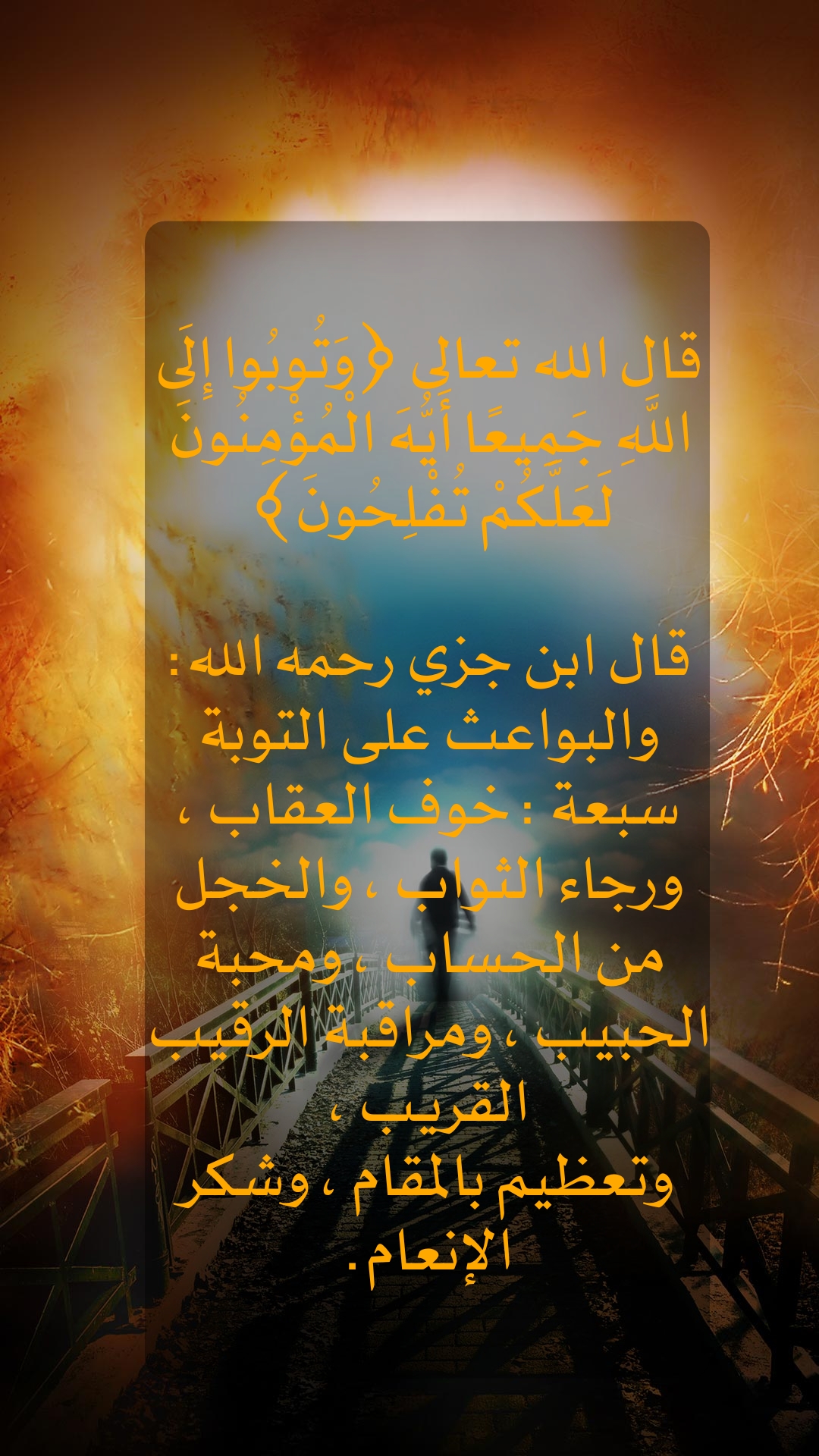قال الله تعالى ( وَتُوبُوا إِلَى اللَّهِ جَمِيعًا أَيُّهَ الْمُؤْمِنُونَ لَعَلَّكُمْ تُفْلِحُونَ ) قال ابن جزي رحمه الله : والبواعث على التوبة سبعة : خوف العقاب ، ورجاء الثواب والخجل من الحساب ومحبة الحبيب ، ومراقبة الرقيب القريب وتعظيم بالمقام ، وشكر الإنعام .