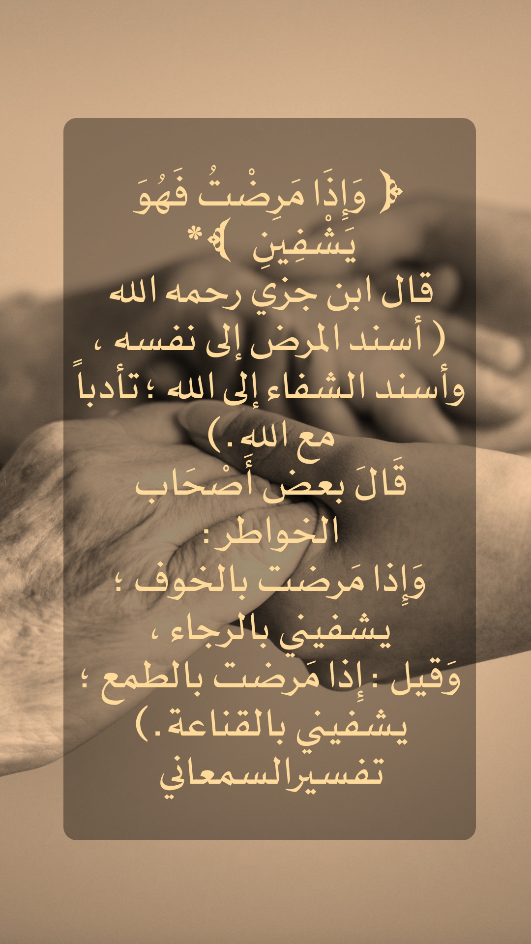 (وَإِذَا مَرِضْتُ فَهُوَ يَشْفِينِ )* قال ابن جزي رحمه الله ( أسند المرض إلى نفسه ، وأسند الشفاء إلى الله ؛ تأدباً مع الله) قَالَ بعض أَصْحَابِ الخواطر وإذا مرضت بالخوف ؛ يشفيني بالرجاء ، وقيل : إذا مرضت بالطمع ؛ يشفيني بالقناعة . )