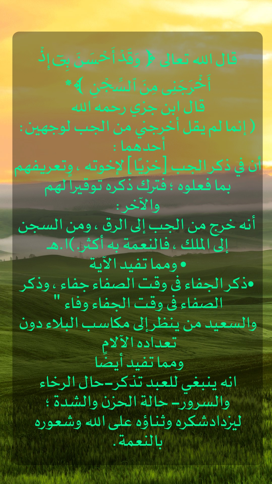 قال الله تعالى ( وَقَدْ أَحْسَنَ بِي إِذْ أَخْرجَنِي مِنَ السِّجْنِ) قال ابن جزي رحمه الله ( إنما لم يقل أخرجني من الجب لوجهين : أحدهما : أن في ذكر الجب [ خزيا ] لإخوته ، وتعريفهم بما فعلوه ؛ فترك ذكر... المزيد
