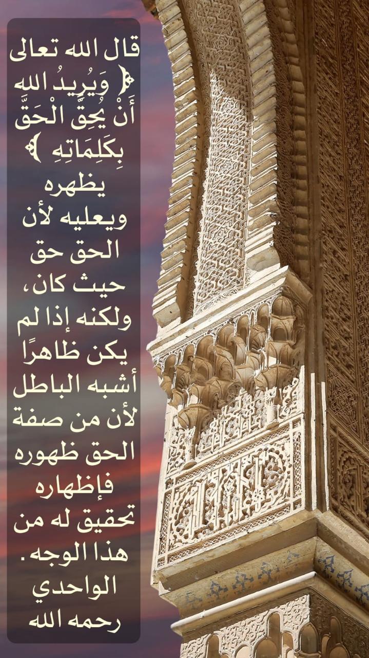 الله تعالى: ﴿وَيُرِيدُ اللَّهُ أَن يُحِقَّ الْحَقَّ بِكَلِمَاتِهِ﴾ "يظهره ويعليه لأن الحق حق حيث كان، ولكنه إذا لم يكن ظاهرا أشبه الباطل لأن من صفة الحق ظهوره فإظهاره تحقيق له من هذا الوجه."