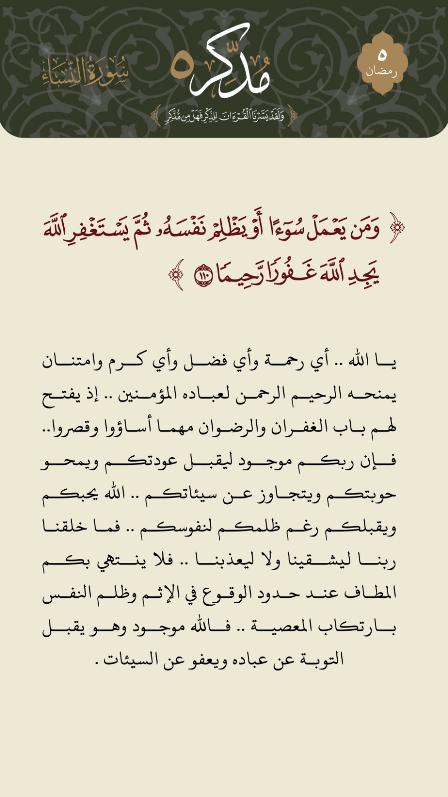 ﴿وَمَن يَعْمَلْ سُوءًا أَوْ يَظْلِمْ نَفْسَهُ ثُمَّ يَسْتَغْفِرِ اللَّهَ يَجِدِ اللَّهَ غَفُورًا رَّحِيمًا﴾