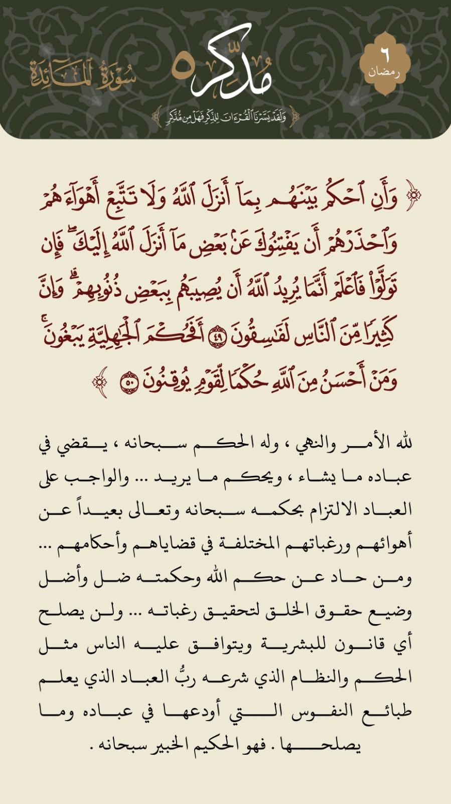﴿وَأَنِ احْكُم بَيْنَهُم بِمَا أَنزَلَ اللَّهُ وَلَا تَتَّبِعْ أَهْوَاءَهُمْ وَاحْذَرْهُمْ أَن يَفْتِنُوكَ عَن بَعْضِ مَا أَنزَلَ اللَّهُ إِلَيْكَ فَإِن تَوَلَّوْا فَاعْلَمْ أَنَّمَا يُرِيدُ اللَّهُ أ... المزيد