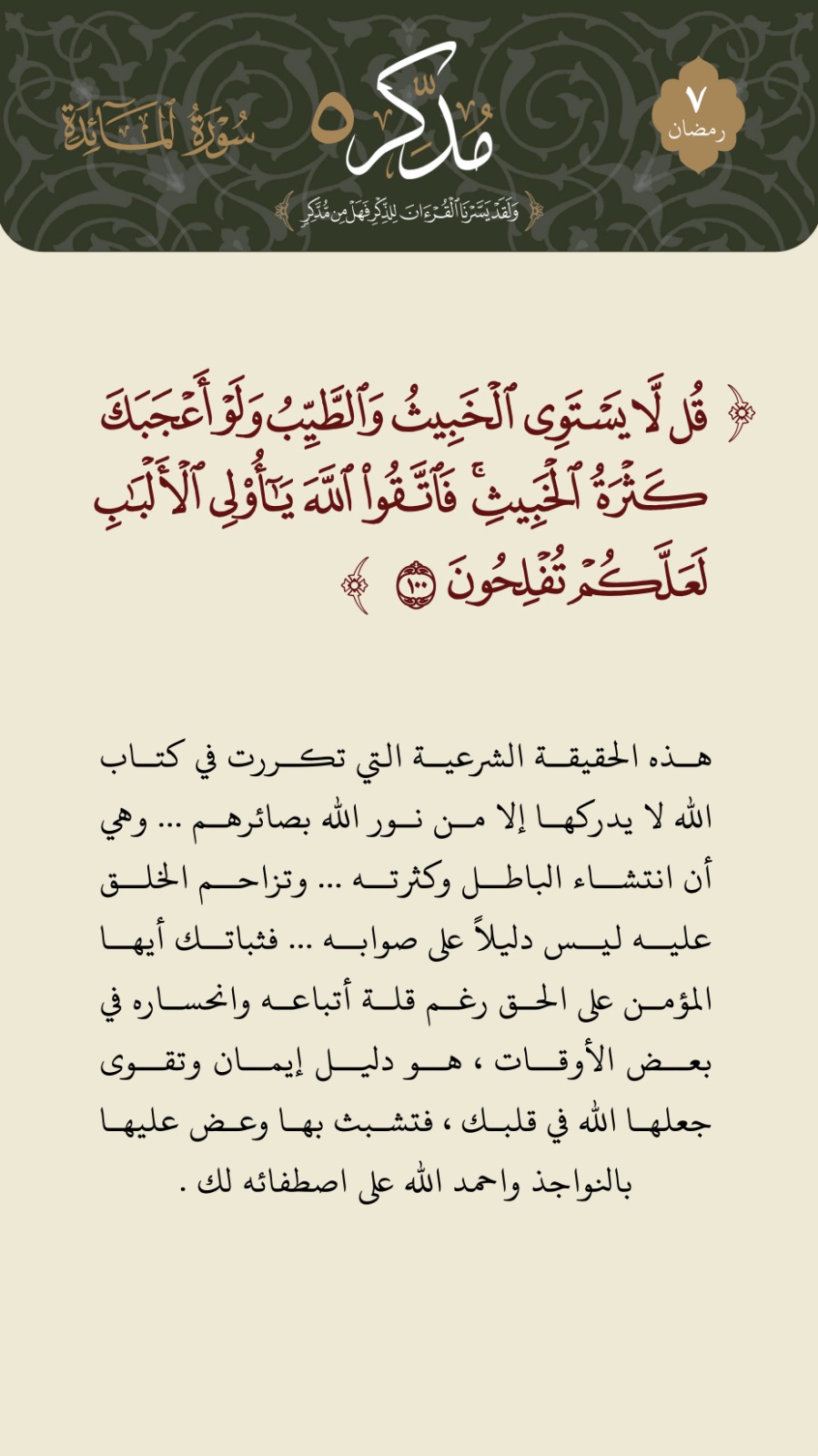 ﴿قُل لَّا يَسْتَوِي الْخَبِيثُ وَالطَّيِّبُ وَلَوْ أَعْجَبَكَ كَثْرَةُ الْخَبِيثِ فَاتَّقُوا اللَّهَ يَا أُولِي الْأَلْبَابِ لَعَلَّكُمْ تُفْلِحُونَ﴾
