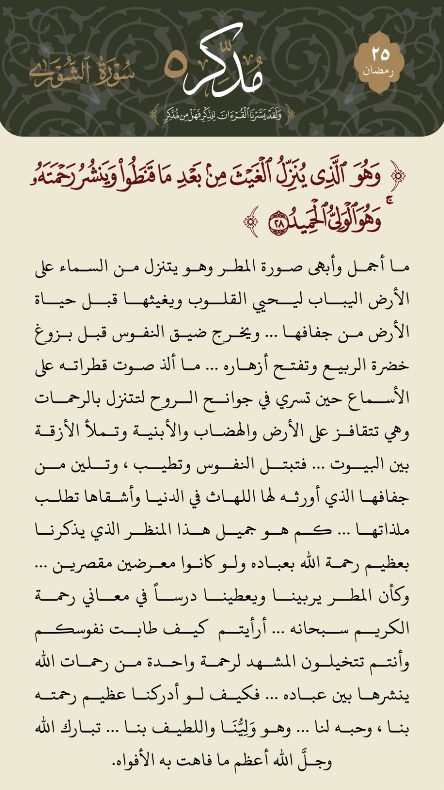 ﴿وَهُوَ الَّذِي يُنَزِّلُ الْغَيْثَ مِن بَعْدِ مَا قَنَطُوا وَيَنشُرُ رَحْمَتَهُ وَهُوَ الْوَلِيُّ الْحَمِيدُ﴾