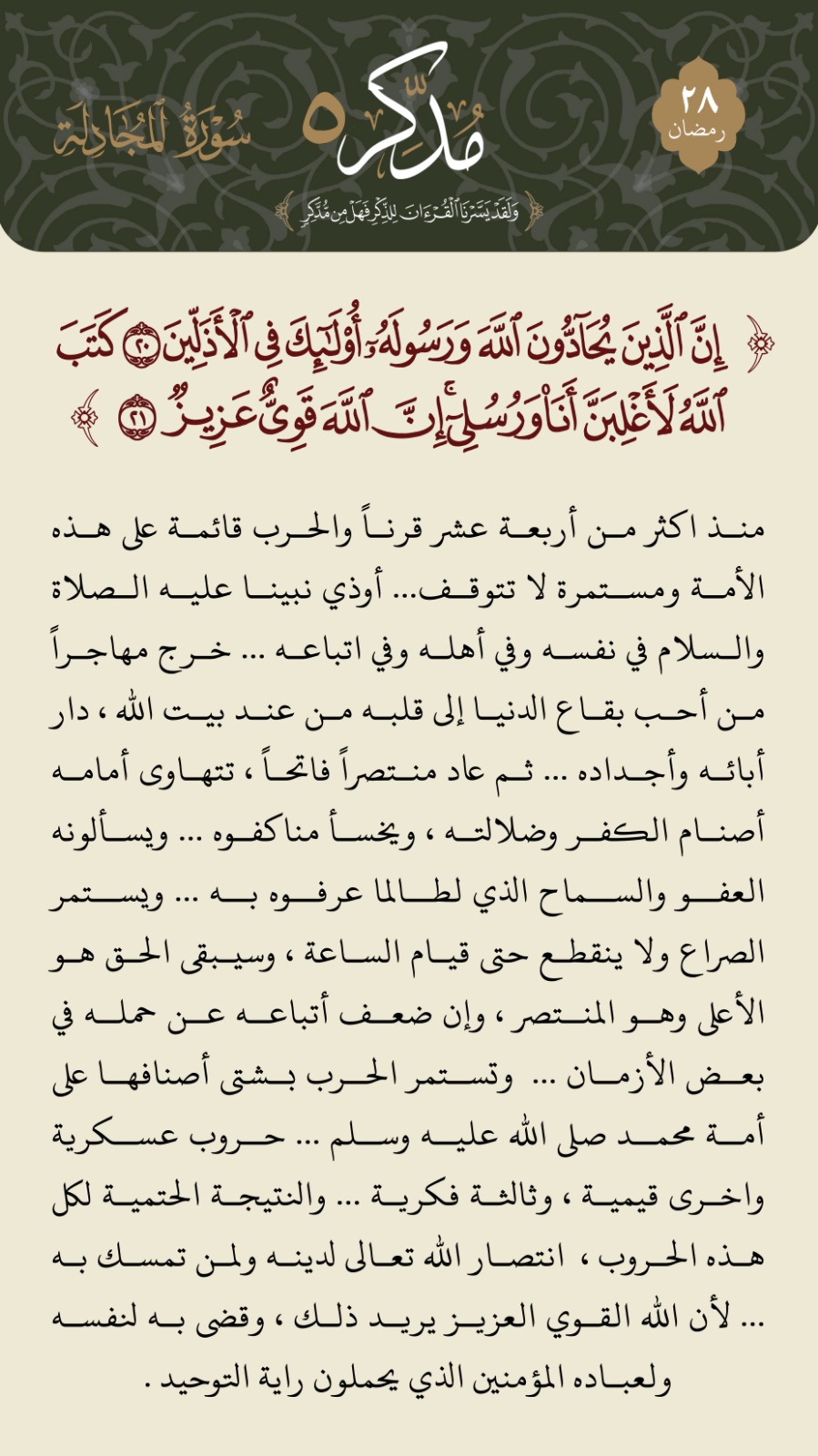 ﴿إِنَّ الَّذِينَ يُحَادُّونَ اللَّهَ وَرَسُولَهُ أُولَئِكَ فِي الْأَذَلِّينَ .كَتَبَ اللَّهُ لَأَغْلِبَنَّ أَنَا وَرُسُلِي إِنَّ اللَّهَ قَوِيٌّ عَزِيزٌ ﴾