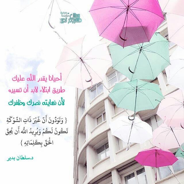 أحيانا يقدر الله عليك طريق ابتلاء لابد أن تسيره لأن نهايته نصرك وظفرك (وَتَوَدُّونَ أَنَّ غَيْرَ ذَاتِ الشَّوْكَةِ تَكُونُ لَكُمْ وَيُرِيدُ اللَّهُ أَن يُحِقَّ الْحَقَّ بِكَلِمَاتِهِ)