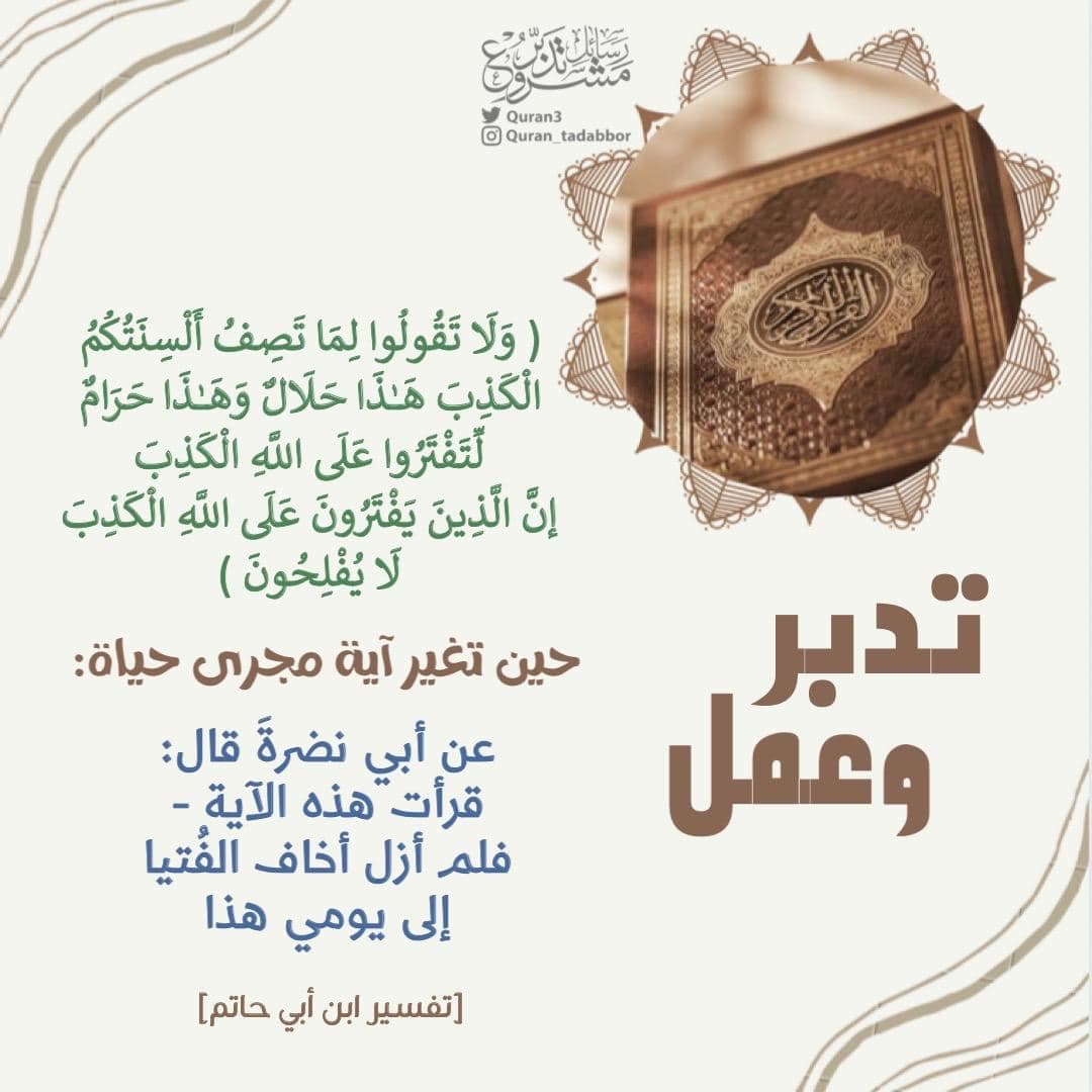 الْكَذِبَ هَٰذَا حَلَالٌ وَهَٰذَا حَرَامٌ لِّتَفْتَرُوا عَلَى اللَّهِ الْكَذِبَ ۚ إِنَّ الَّذِينَ يَفْتَرُونَ عَلَى اللَّهِ الْكَذِبَ لَا يُفْل... المزيد