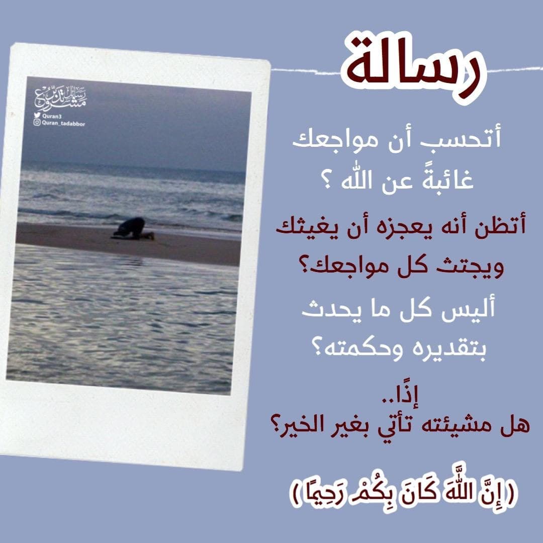 رسالة أتحسب أن مواجعك غائبةً عن الله ‏أتظن أنه يعجزه أن يغيثك ويجتث كل مواجعك أليس كل ما يحدث بتقديره وحكمته ‏إذاً. ‏هل مشيئته تأتي بغير الخير ( إِنَّ اللَّهَ كَانَ بِكُمْ رَحِيمًا )