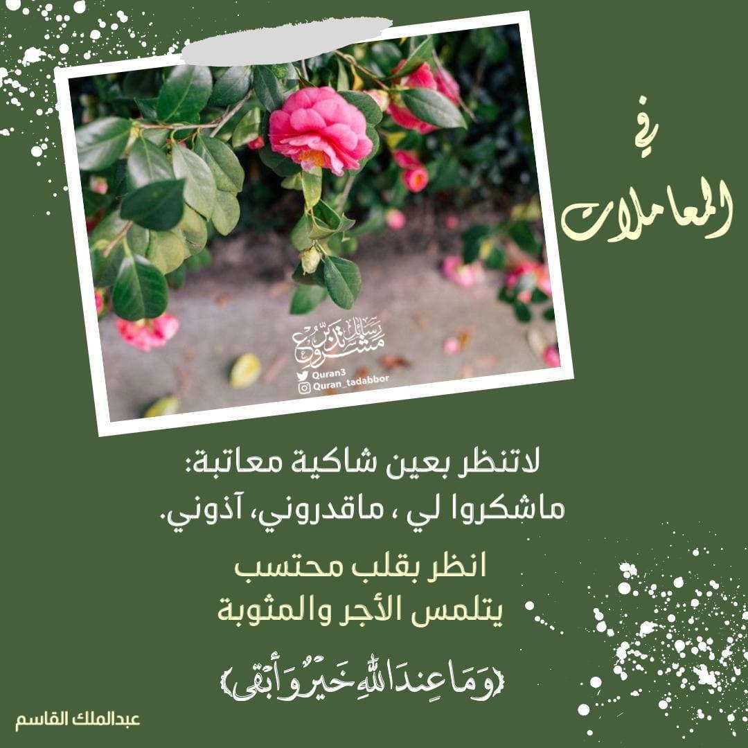 في المعاملات •• ‏لاتنظر بعين شاكية معاتبة: ‏ماشكروا لي ، ‏ماقدروني، ‏آذوني. ‏انظر بقلب محتسب ‏يتلمس الأجر والمثوبة ‏( وَمَا عِندَ اللَّهِ خَيْرٌ وَأَبْقَىٰ )