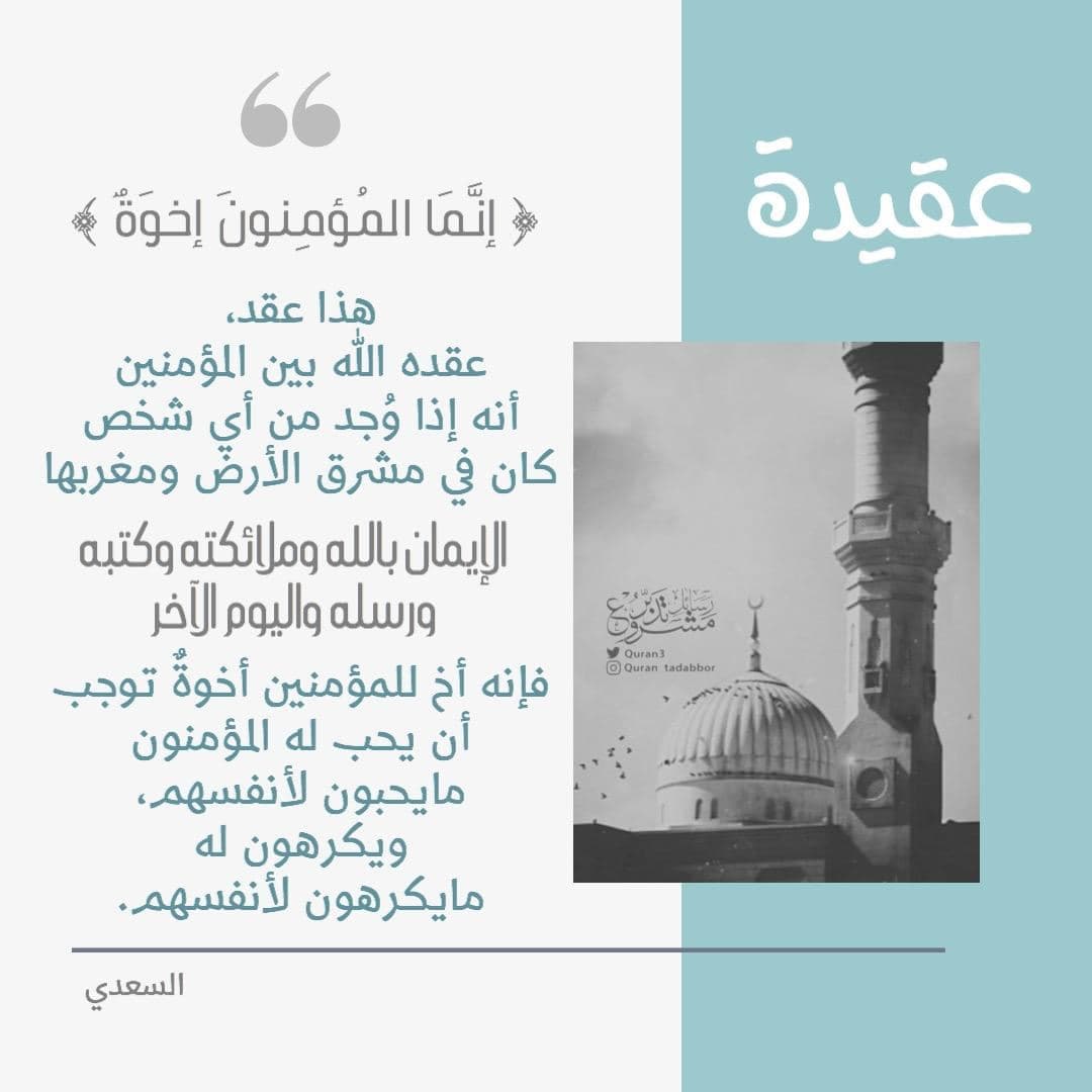 عقيدة ‏﴿إنَّمَا المُؤمِنونَ إخوَةٌ﴾ ‏هذا عقد، عقده الله بين المؤمنين أنه إذا وُجد من أي شخص كان في مشرق الأرض ومغربها الإيمان بالله وملائكته وكتبه ورسله واليوم الآخر فإنه أخ للمؤمنين أخوةٌ توجب أن يحب له المؤمنون مايحبون لأنفسهم، ويكرهون له مايكرهون لأنفسهم.