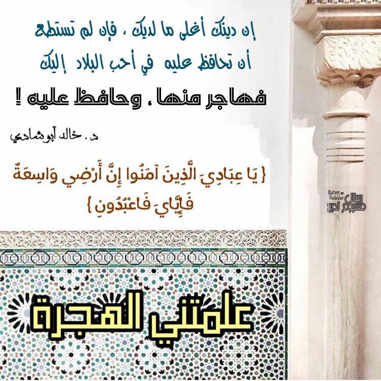‌‏⁧ علمتني_الهجرة أن دينك أغلى ما لديك فإن لم تستطع أن تحافظ عليه في أحب البلاد إليك، فهاجر منها، وحافظ عليه د. خالد ابو شادي { يَا عِبَادِيَ الَّذِينَ آمَنُوا إِنَّ أَرْضِي وَاسِعَةٌ فَإِيَّايَ فَاعْبُدُونِ }