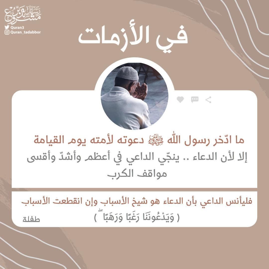 في الأزمات ‏ما ادّخر رسول الله ﷺ دعوته لأمته يوم القيامة، إلا لأن الدعاء .. ينجّي الداعي في أعظم وأشدّ وأقسى مواقف الكرب. ‏فليأنس الداعي بأن الدعاء هو شيخ الأسباب وإن انقطعت الأسباب. ( وَيَدْعُونَنَا رَغَبًا وَرَهَبًا ۖ )