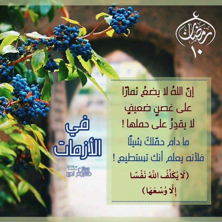 في الأزمات. ‏إنّ اللهُ لا يضعُ ثماراً ‏على غصنٍ ضعيفٍ ‏ لا يقدِرُ على حملها ‏ما دام حمَّلكَ شيئاً فلأنه يعلم أنك تستطيع ! ( لَا يُكَلِّفُ اللَّهُ نَفْسًا إِلَّا وُسْعَهَا ۚ )