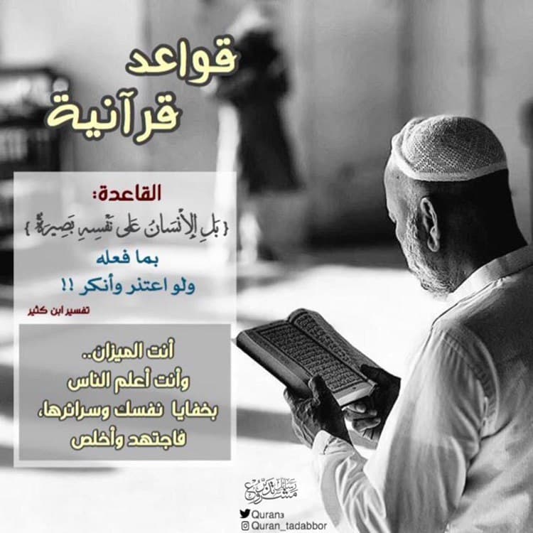 قواعد قرآنية القاعدة ‏{ بَلِ الْإِنسَانُ عَلَىٰ نَفْسِهِ بَصِيرَةٌ } بما فعله ولو اعتذر وأنكر - تفسير ابن كثير - أنت الميزان..وأنت أعلم الناس بخفـايـا نـفسك وسـرائرها، فاجتهد وأخلص