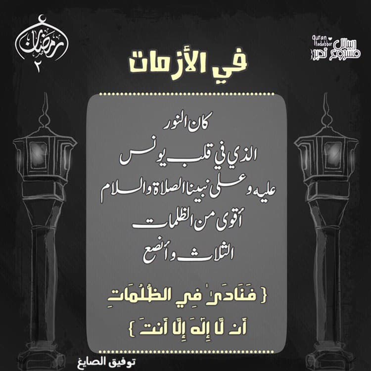في الأزمات ‏ كان النور الذي في قلب ( يونس ) عليه وعلى نبينا الصلاة والسلام أقوى من الظلمات الثلاث وأنصع . { فَنَادَىٰ فِي الظُّلُمَاتِ أَن لَّا إِلَٰهَ إِلَّا أَنتَ }