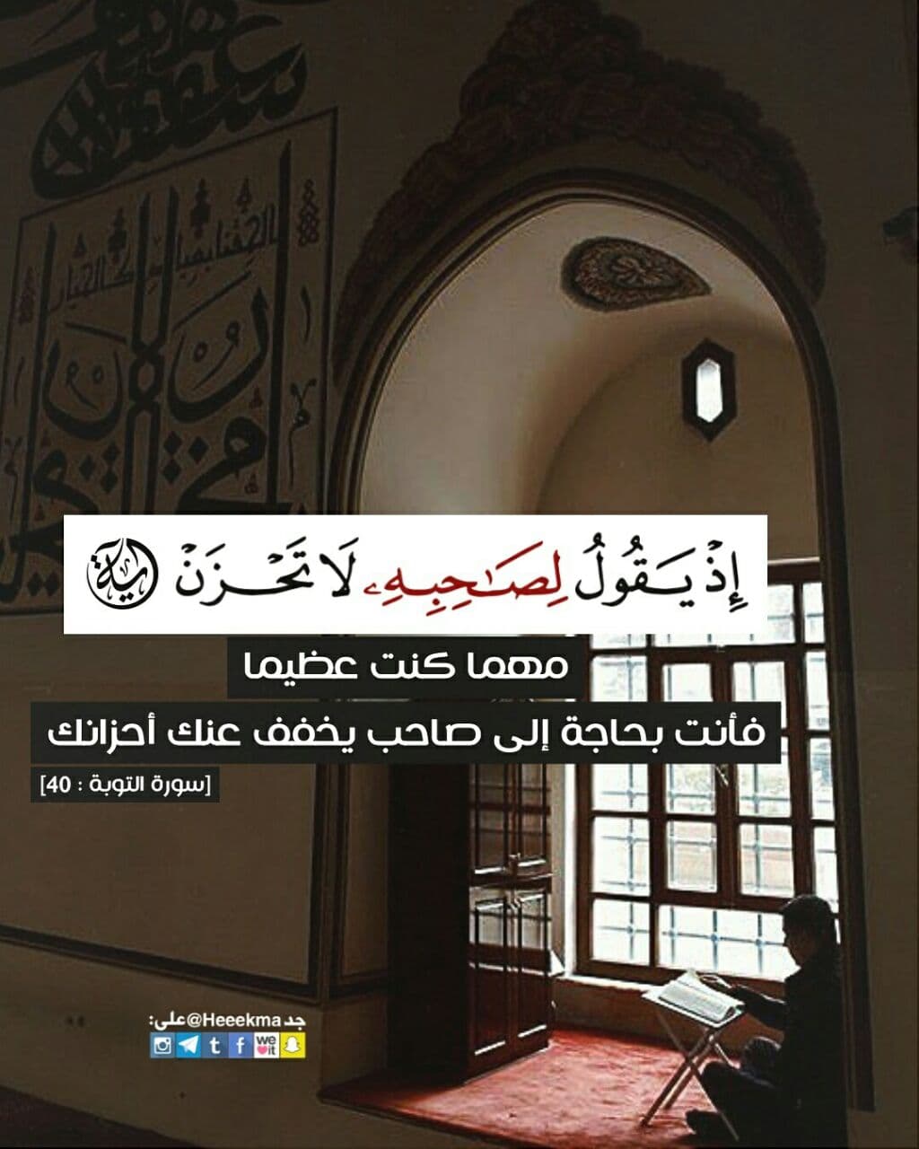 • ﴿إِلَّا تَنصُرُوهُ فَقَدْ نَصَرَهُ اللَّهُ إِذْ أَخْرَجَهُ الَّذِينَ كَفَرُوا ثَانِيَ اثْنَيْنِ إِذْ هُمَا فِي الْغَارِ إِذْ يَقُولُ لِصَاحِبِهِ لَا تَحْزَنْ إِنَّ اللَّهَ مَعَنَا فَأَنزَلَ اللَّهُ سَكِينَتَهُ عَلَيْهِ وَأَيَّدَهُ بِجُنُودٍ لَّمْ تَرَوْهَا وَجَعَلَ كَلِمَةَ الَّذِينَ كَفَرُوا السُّفْلَى وَكَلِمَةُ اللَّهِ هِيَ الْعُلْيَا وَاللَّهُ عَزِيزٌ حَكِيمٌ ﴿٤٠﴾    [التوبة   آية:٤٠]