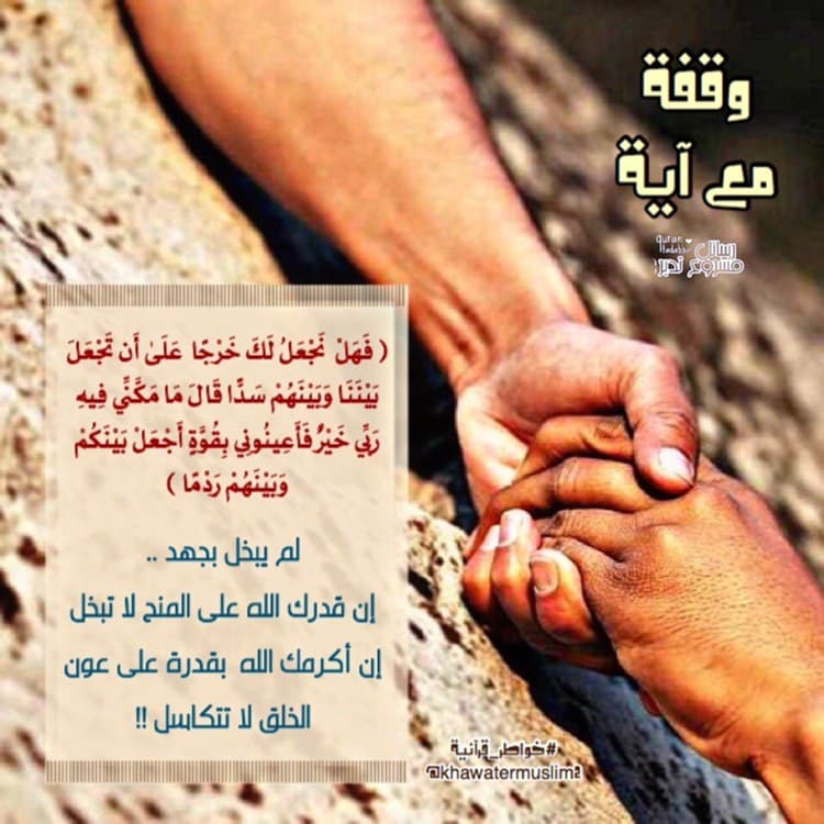 علمتني سورة الكهف ( فَهَلْ نَجْعَلُ لَكَ خَرْجًا عَلَىٰ أَن تَجْعَلَ بَيْنَنَا وَبَيْنَهُمْ سَدًّا قَالَ مَا مَكَّنِّي فِيهِ رَبِّي خَيْرٌ فَأَعِينُونِي بِقُوَّةٍ أَجْعَلْ بَيْنَكُمْ وَبَيْنَهُمْ ... المزيد
