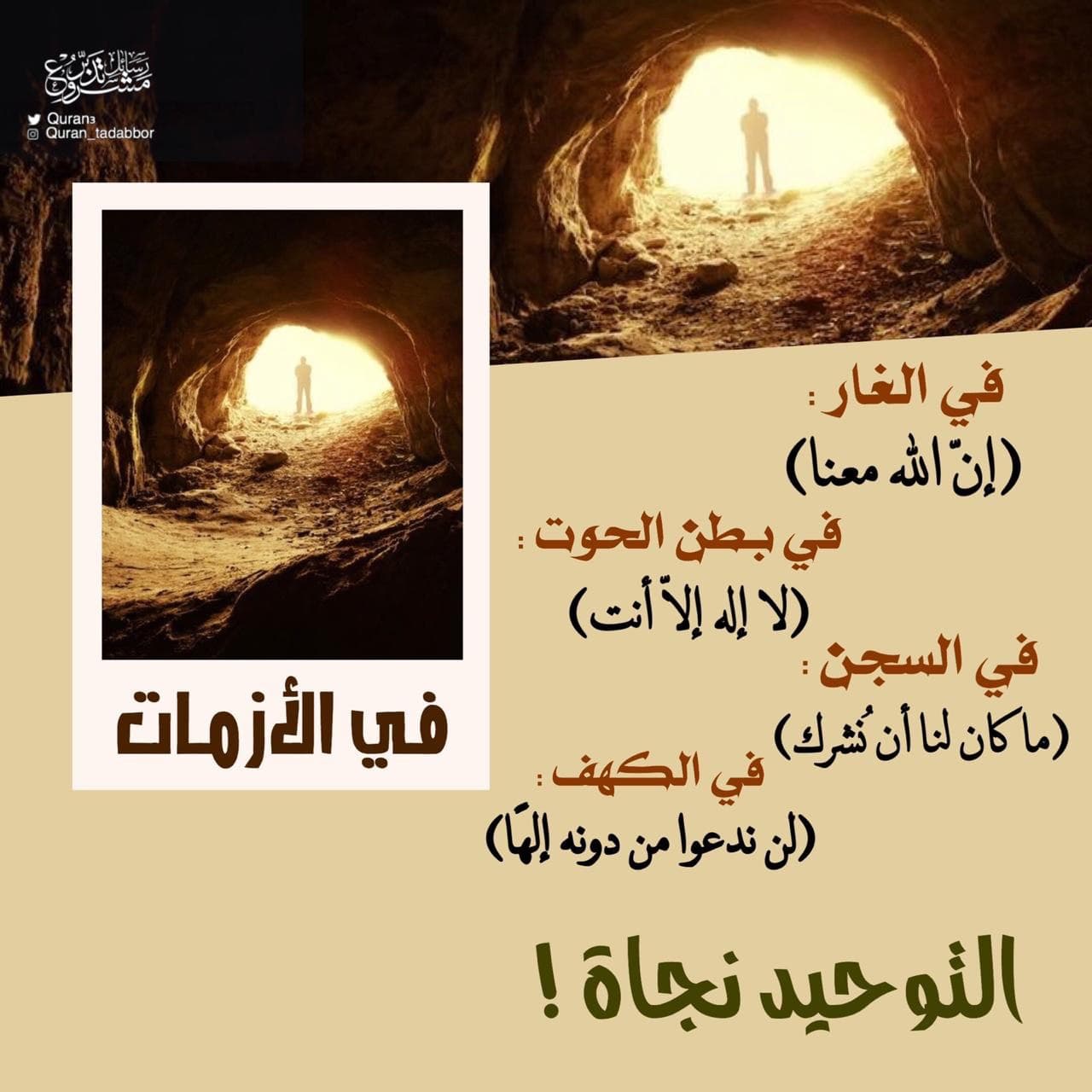في الأزمات في الغار : "إنّ الله معنا" ‏في بطن الحوت : "لا إله إلّا أنت" ‏في السجن : ما كان لنا أن نُشرك" ‏في الكهف : لن ندعوا من دونه إلهًا التوحيد نجاة