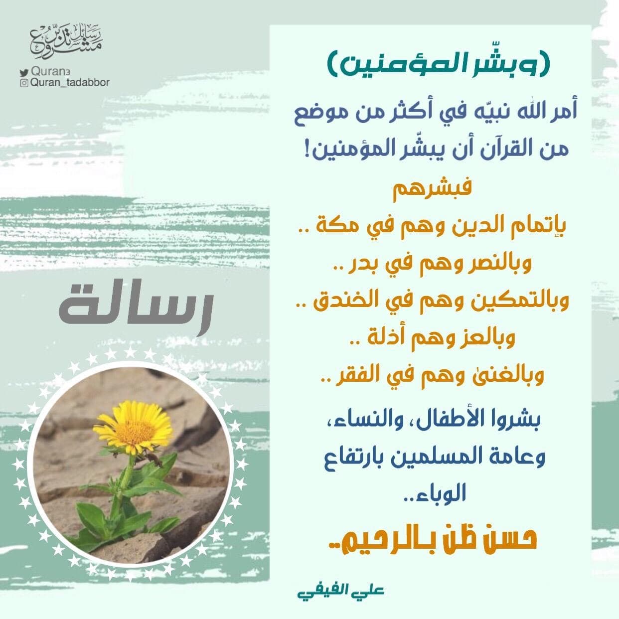 رسالة ‏ ( وبشّر المؤمنين ) ‏أمر الله نبيّه في أكثر من موضع من القرآن أن يبشّر المؤمنين ‏فبشرهم بإتمام الدين .. وهم في مكة . ‏وبالنصر .. وهم في بدر . ‏وبالتمكين .. وهم في الخندق . ‏وبالعز .. وهم أذ... المزيد