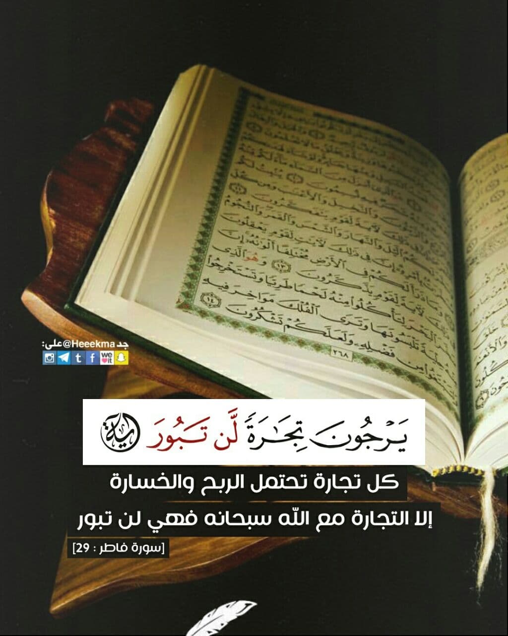 • ﴿إِنَّ الَّذِينَ يَتْلُونَ كِتَابَ اللَّهِ وَأَقَامُوا الصَّلَاةَ وَأَنفَقُوا مِمَّا رَزَقْنَاهُمْ سِرًّا وَعَلَانِيَةً يَرْجُونَ تِجَارَةً لَّن تَبُورَ ﴿٢٩﴾    [فاطر   آية:٢٩]