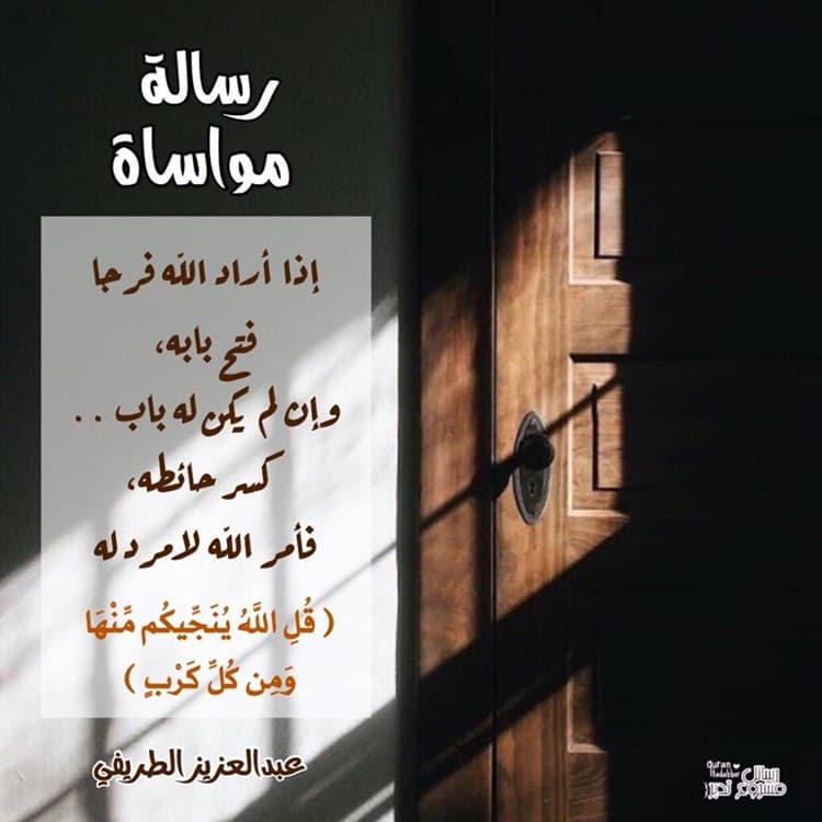 ‏رسالة مواساة ‏إذا أراد الله فرجاً فتح بابه، وإن ‏لم يكن له باب .. كسر حائطه، ‏فأمر الله لا مرد له . ‏( قُلِ اللَّهُ يُنَجِّيكُم مِّنْهَا ‏ وَمِن كُلِّ كَرْبٍ )