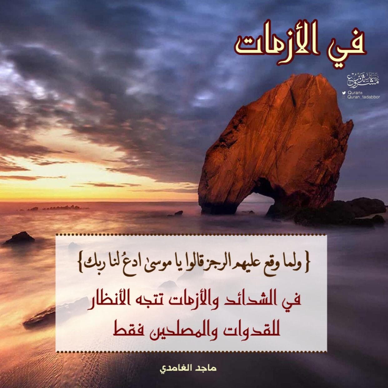 في الأزمات ﴿ وَلَمَّا وَقَعَ عَلَيْهِمُ الرِّجْزُ قَالُوا يَامُوسَى ادْعُ لَنَا رَبَّكَ ﴾. ‏في الشدائد والأزمات تتجه الأنظار للقدوات والمصلحين فقط .