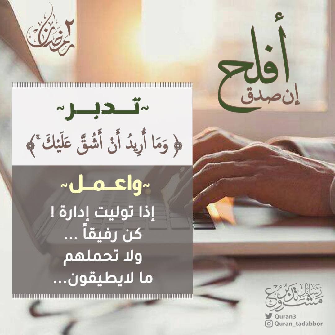 أفلح إن صدق•• تدبَّر : ‏﴿وَمَا أُرِيدُ أَنْ أَشُقَّ عَلَيْكَ ۚ﴾ واعمل : ‏إذا توليت إدارة ! ‏كن رفيقًا ... ‏ولا تحملهم ما لايطيقون...