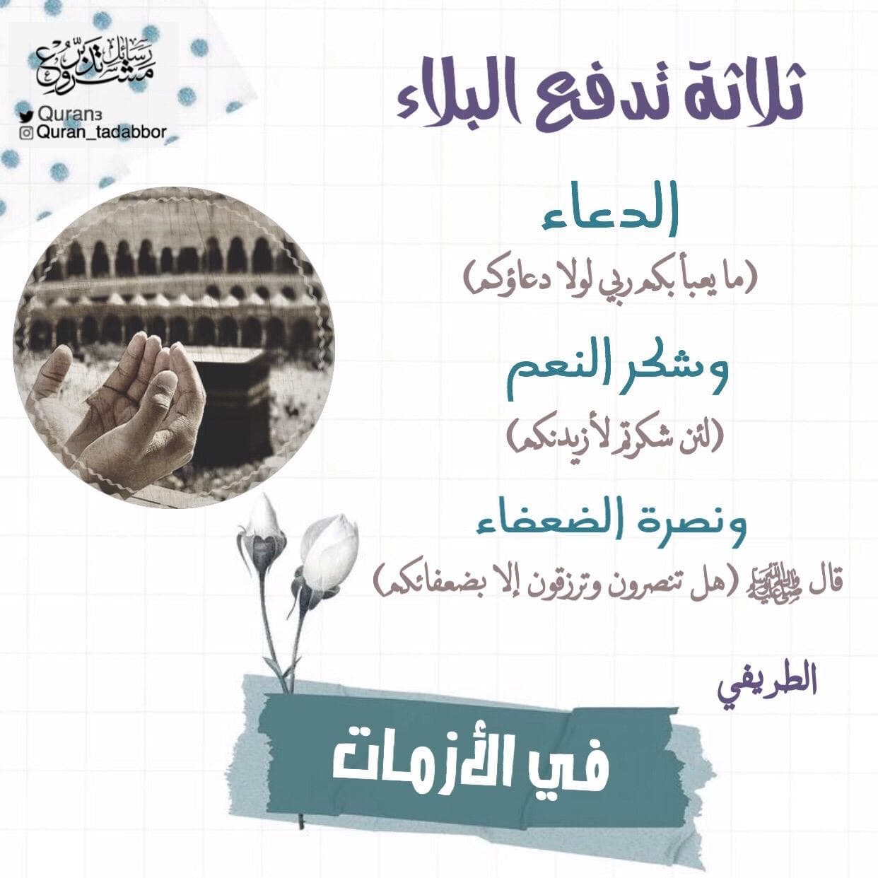 في الأزمات ثلاثة تدفع البلاء ‏لدعاء ( قُلْ مَا يَعْبَأُ بِكُمْ رَبِّي لَوْلَا دُعَاؤُكُمْ ) ‏وشكر النعم .. ( لَئِن شَكَرْتُمْ لَأَزِيدَنَّكُمْ ) ‏ ونصرة الضعفاء .. قال ﷺ (هل تنصرون وترزقون إلا بضعفائكم)