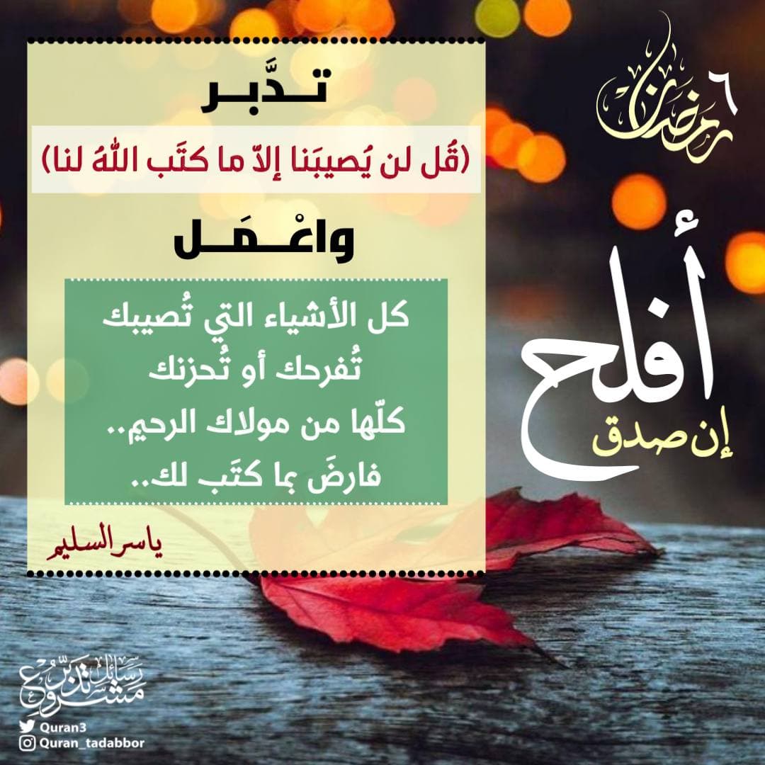 أفلح إن صدق•• ♦️تدبَّر : (قُل لن يُصيبَنا إلاّ ما كتَب اللهُ لنا) ♦️واعمل : كل الأشياء التي تُصيبك تُفرحك أو تُحزنك.. كلّها من مولاك الرحيم.. فارضَ بما كتَب لك.