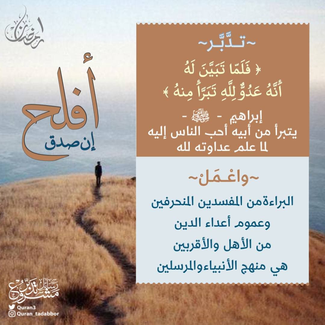 أفلح إن صدق•• تدبَّر : قال تعالى : ‏﴿ فَلَمّا تَبَيَّنَ لَهُ أَنَّهُ عَدُوٌّ لِلَّهِ تَبَرَّأَ مِنهُ ﴾ ‏إبراهيم - ﷺ - يتبرأ من أبيه ‏أحب الناس إليه لما علم عداوته لله. واعمل : البراءة من المفسدين المنحرفين وعموم أعداء الدين من الأهل والأقربين هي منهج الأنبياء و المرسلين