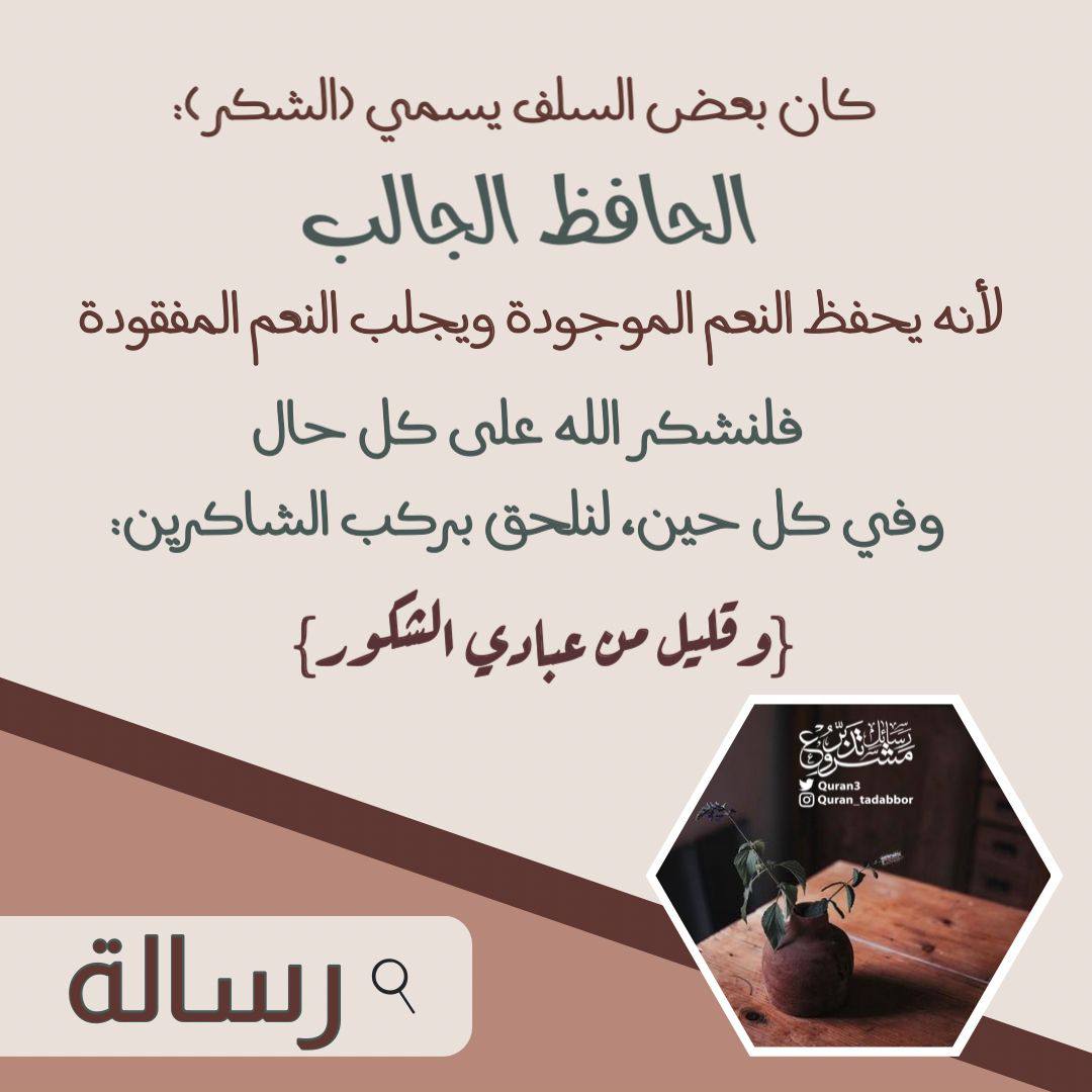 • كان بعض السلف يسمي (الشكر): الحافظ الجالب؛ لأنه يحفظ النعم الموجودة، ويجلب النعم المفقودة، فلنشكر الله على كل حال، وفي كل حين، لنلحق بركب الشاكرين: (وقليل من عبادي الشكور).