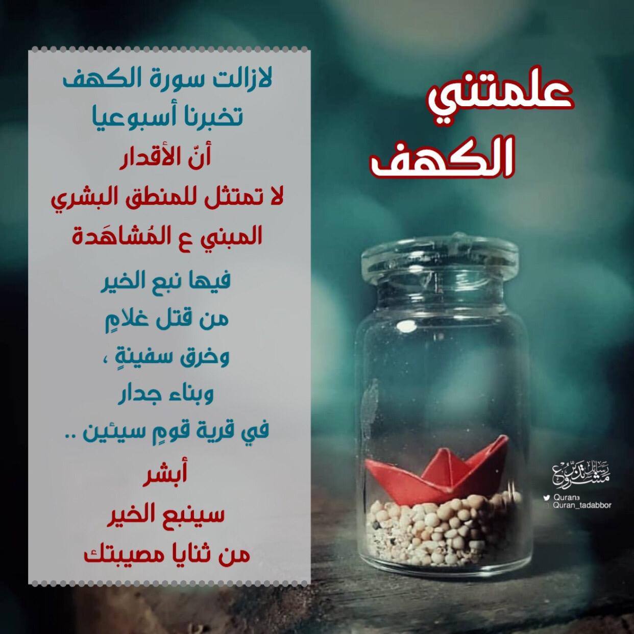 لازالت سورة الكهف تخبرنا أسبوعياً أنّ الأقدار لا تمتثل للمنطق البشري المبني ع المُشاهَدة؛ فيها نبع الخير من قتل غلامٍ، وخرق سفينةٍ، وبناء جدار في قرية قومٍ سيئين .. أبشر؛ سينبع الخير من ثنايا مصيبتك.
