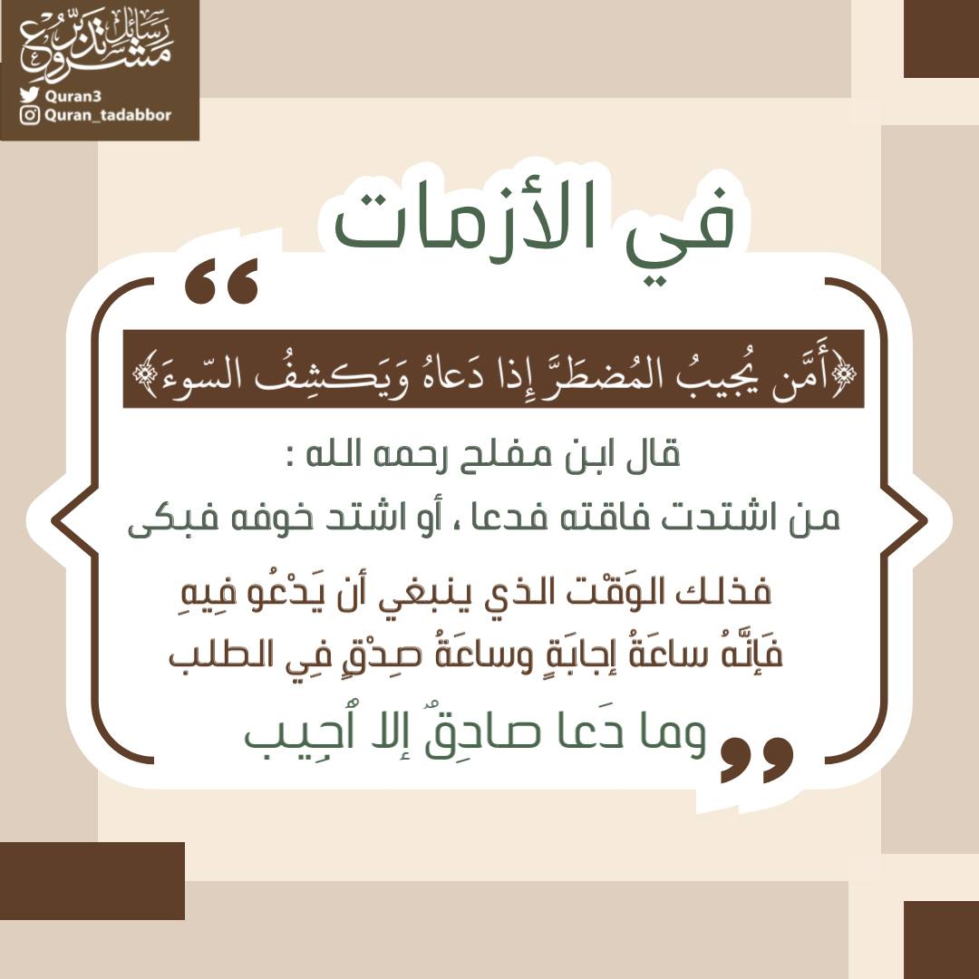 قال ابن مفلح رحمه الله: من اشتدت فاقته فدعا، أو اشتد خوفه فبكى، فذلك الوَقْت الذي ينبغي أن يَدْعُو فِيهِ فَإنَّهُ ساعَةُ إجابَةٍ وساعَةُ صِدْقٍ فِي الطلب وما دَعا صادِقٌ إلا أُجِيب.